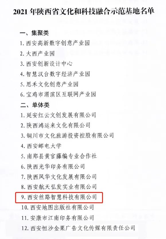 近日,2021年陜西省文化和科技融合示范基地名單出爐,經(jīng)推薦上報(bào)、形式初審、專家評(píng)審、現(xiàn)場(chǎng)考察等程序,由中共陜西省委宣傳部與陜西省科學(xué)技術(shù)廳審定,認(rèn)定西安絲路智慧科技有限公司被認(rèn)定為單位類陜西省文化和科技融合示范基地。