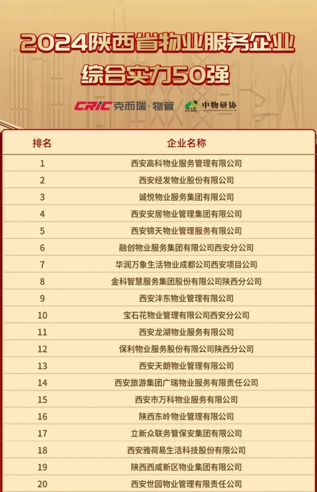 2025年1月3日,克而瑞物管與中物研協(xié)聯(lián)合發(fā)布「2024陜西省物業(yè)管理行業(yè)綜合實(shí)力測(cè)評(píng)成果」。同期揭曉了“2024年陜西省物業(yè)服務(wù)企業(yè)綜合實(shí)力50強(qiáng)”以及各細(xì)分領(lǐng)域榜單,為陜西省物業(yè)服務(wù)力樹立了風(fēng)向標(biāo)。