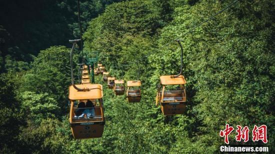 圖為游人乘坐纜車觀賞秦嶺風光。
