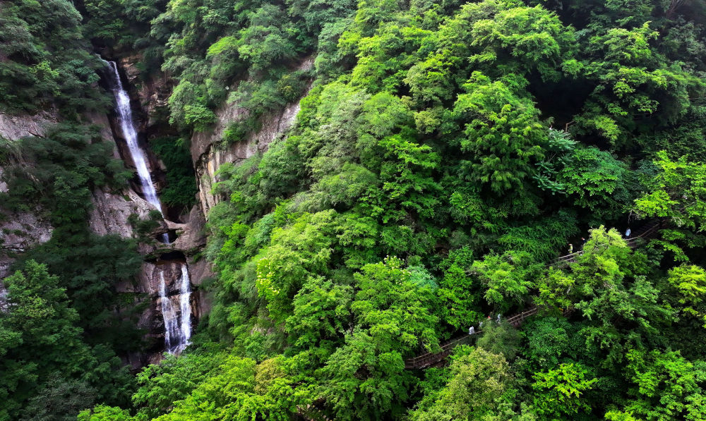 ↑游客在西安太平國家森林公園游覽(無人機(jī)照片,5月26日攝)。