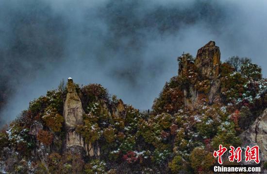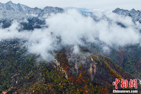 近日,位于陜西西安的秦嶺翠華山迎來降雪,白雪點綴在色彩斑斕的秦嶺山巒上,美如畫卷,吸引了不少游人前來登山賞雪。圖為秦嶺雪景。