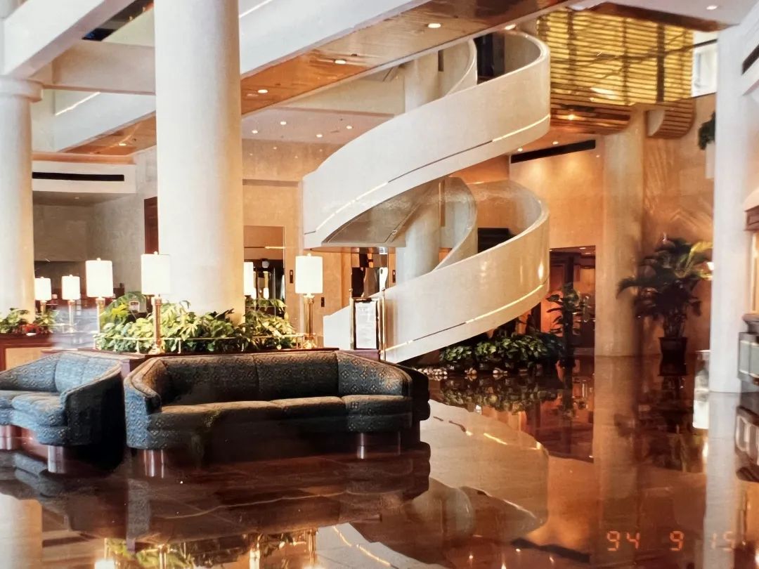 照片由上至下分別是1994年金花大酒店的大堂、旋轉(zhuǎn)樓梯、中餐廳、西餐廳、大堂吧